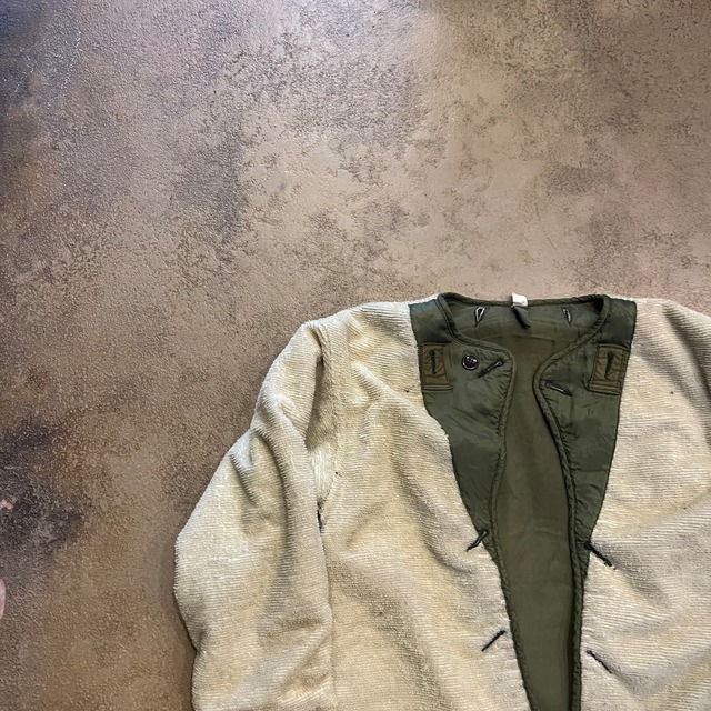 ⚫︎ブランド:French army ⚫︎年代:1960's ⚫︎素材:コットン ⚫︎カラー:オリーブグリーン ⚫︎サイズ:メンズM相当 着丈 61㎝ 袖丈 51㎝ 肩幅 51㎝ 身幅 62㎝ アメリカ軍が第二次大戦で使用したN–1デッキジャケットを原型とした、海軍水兵のために作られたデッキジャケット。 アメリカ軍のN-1よりも身幅が広めで、オーバーサイズでも着やすい印象。 表地は、耐久性に優れたコットン100%ジャングルクロス。 内側はアクリルボア仕様。 放出量が少なく、極めてレアなお品物です! ※返品交換不可 ※フード欠損 ※採寸に関しては多少の誤差が発生します。ご購入後の採寸違いによるお問い合わせはお受けできません。 no.842