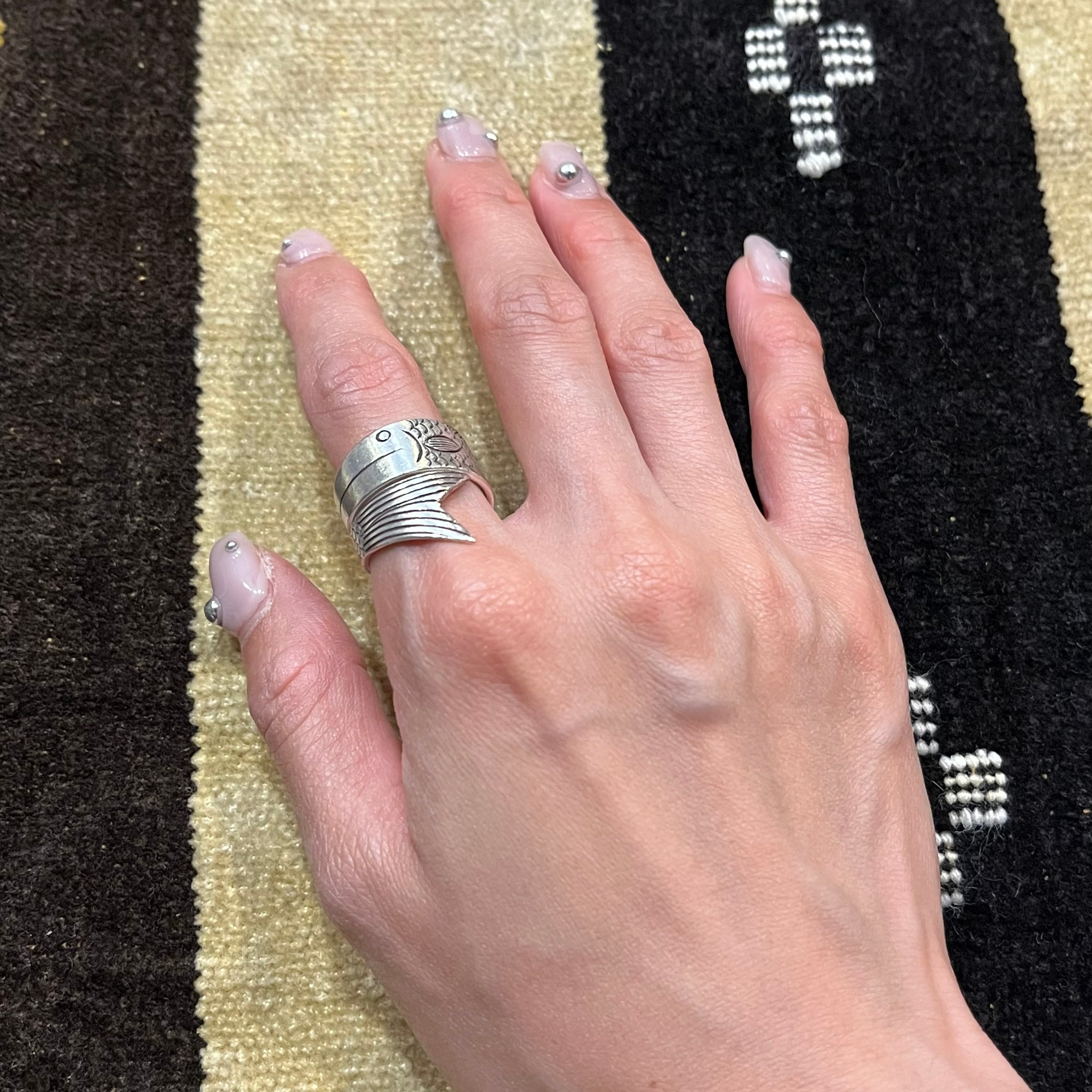 タイの山岳少数民族「カレン族」ハンドメイドのシルバーリングです。自然と共存するカレン族には自然を畏怖するとともに敬う「アニミズム」思想が流れており、モチーフや刻印には身近な動植物や生活に要する道具などを象ったものが数多くあります。
